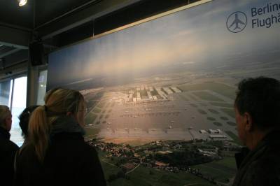 Anschließend ging es auf den Infotower von dem man trotz des schlechten Wetters eine gute Übersicht der östlichen Straßen- und Schienenanbindung und des Terminals hatte. Während über die A113 die Verkehrsanbindung nach Neukölln sehr gut ausgebaut ist, wurde über die fehlende Anbindung ans Berliner U-Bahn-Netz über die U7 diskutiert. Derzeit ist geplant. vom U-Bahnhof Rudow im 3-5 Minuten Takt eine Busanbindung zu realisieren. Da nur wenige Kilometer bis zum Flughafen Berlin Brandenburg zu überwinden sind, sollte eine umweltschonendere Anbindung über die Verlängerung der U7 ernsthaft in Betracht gezogen werden.